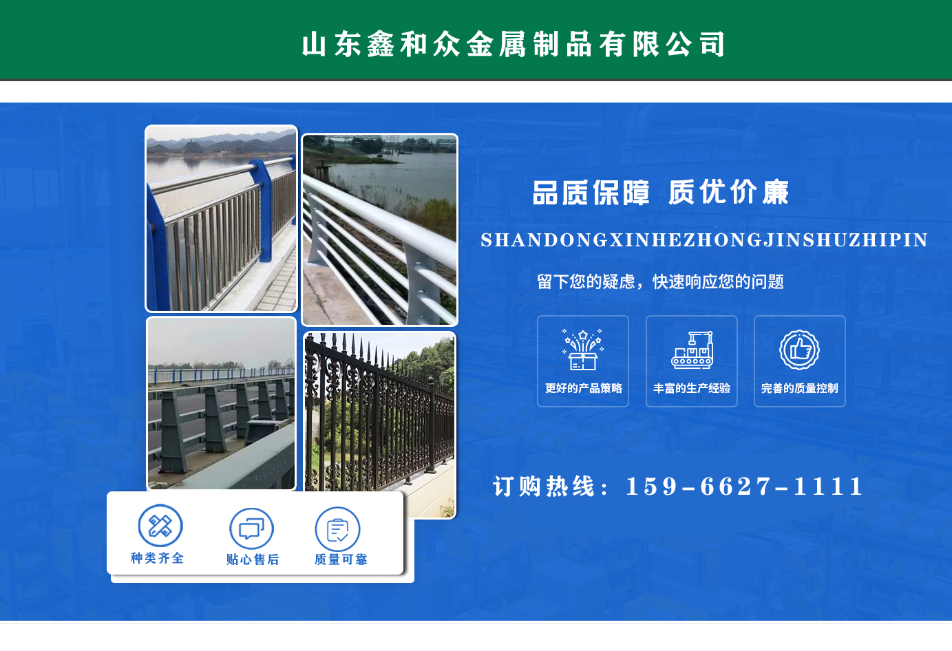 山東鑫和眾金屬制品有限公司主要產品有防撞護欄,橋梁護欄,道路護欄,河道護欄,不銹鋼護欄等護欄。提供設計方案,一站式定制,包您滿意價格優惠,歡迎來電咨詢!    公司常年從事銷售護欄防撞護欄,橋梁護欄,道路護欄,河道護欄,不銹鋼護欄,橋梁鋼護欄,河道燈光護欄等。產品廣泛應用于橋梁、河道、旅游景區、道路、公路、公園、小區、景觀、道路防撞等領域。    公司產品均采用優質不銹鋼材料,符合相關標準。各種型號不銹鋼復合管及護欄,質量嚴格把控。產品強度高、耐腐蝕、焊接牢固、抗沖擊、性能好,防撞護欄結構簡單、美觀實用大方?!    g迎前來訂購!...